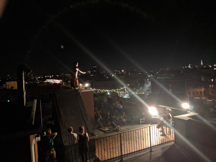 During the summer, I transform my Brooklyn rooftop into a stage for spontaneous performances. Revolving around a a homemade wooden dance floor, each night I curate 6 artists from dance, music and circus and more to share improvised performances. Picnic blankets are laid on the ground, homemade popcorn and drinks fuel the crowd, and between sets, the dance floor is open to everyone.